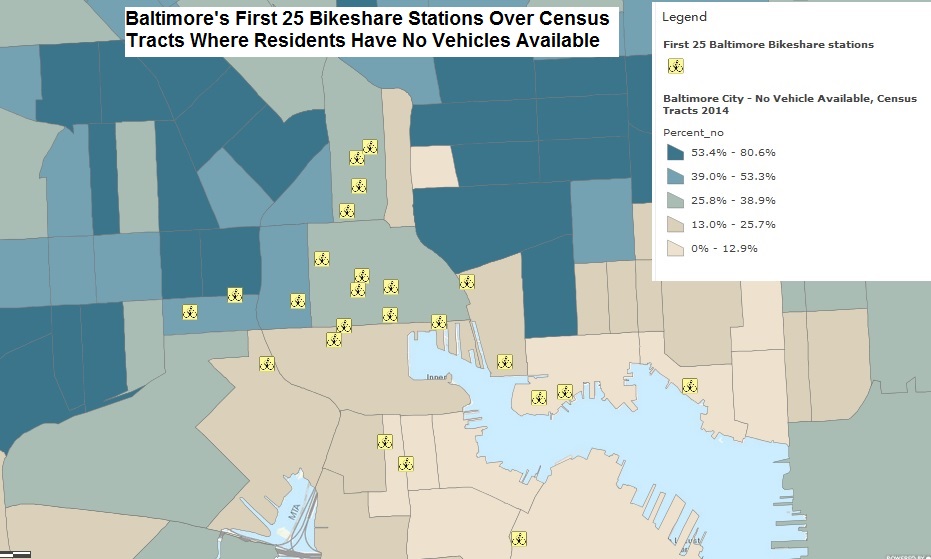At this point I was sure I was on to something, so I continued down the Baltimore bike racism rabbit hole. In May of 2015 I submitted a Maryland Public Information Request to the Baltimore City Department of Transportation(DOT) asking for the locations of all the DOT installed bike racks. Once I received that information I had mapping software geolocate the addresses and the results were even more troubling. The white L emerged like a phoenix. In October of 2016 the city and Bikemore unveiled the first 25 Bikeshare stations, and well, the ugly pattern continued. Regardless of how angry one gets with me I am still merely a messenger. This is about data, data I did not create. I didn't place all the bike racks in the white neighborhoods nor did I avoid placing all the Bikeshare stations in the black neighborhoods. Insulting, bullying, threatening and belittling me won't change the maps. They are what they are. If the city and Bikemore wants productive change it has to stop ignoring this problem, stop conversating about this problem and get out the paint truck and make some lanes where there are no lanes.